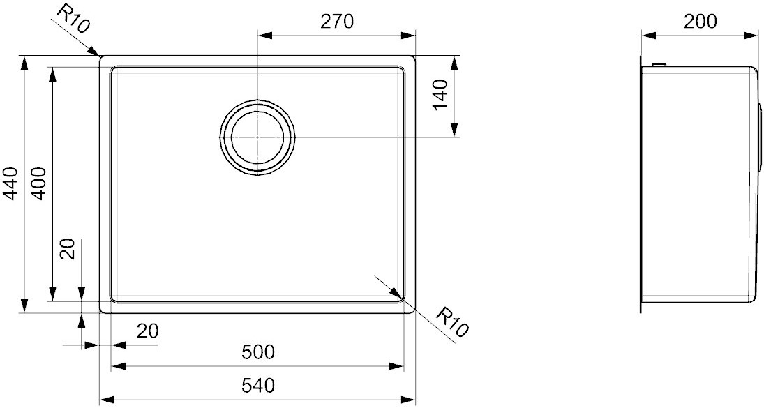 500x400 мм / угловой радиус врезки 10 мм / мм