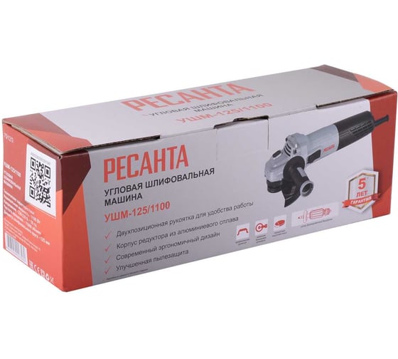 Блокировка кнопки включения, Двойная изоляция провода, Ключ для фиксации диска на валу в комплекте, Металлический редуктор лучше отводит тепло и обеспечивает долгий срок службы, Обрезиненная боковая рукоять для лучшего контроля над Ресанта УШМ-125/1100, Простая установка защитного кожуха, Система блокировки вала