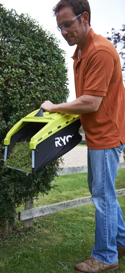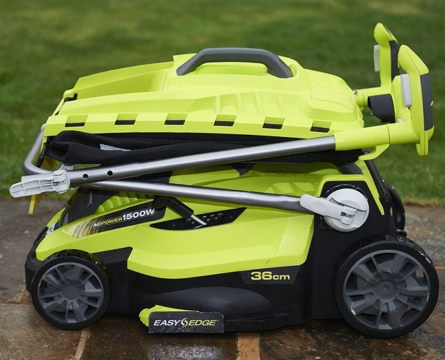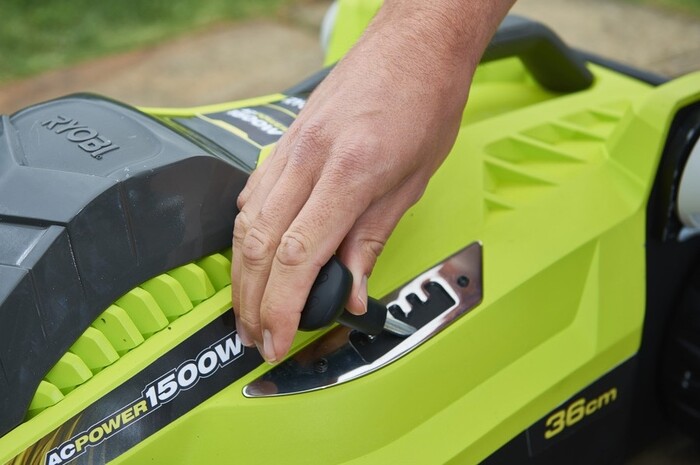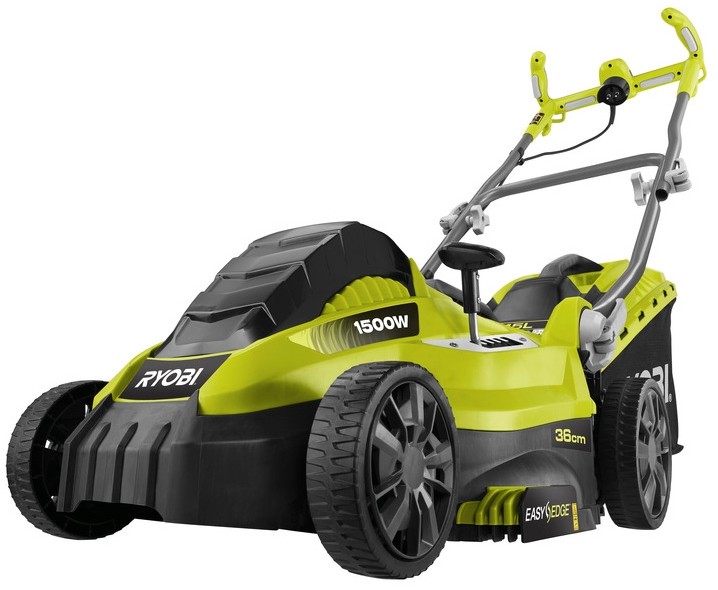 Сетевую газонокосилку бренда Ryobi можно отнести к садовому инструменту нижней части среднего ценового сегмента. Модель имеет довольно компактные размеры и обеспечивает ширину захвата при кошении в 36 см, а значит подойдет для относительно небольших участков площадью до 5 соток. Соответствует подобным объемам работ и мощность электромотора, которая равняется 1500 Вт. Силовой агрегат обеспечивает только вращения лопастного ножа, а сам инструмент в движение необходимо приводить оператору, но особых усилий это не потребует, ведь газонокосилка Ryobi RLM-15E36H весит скромные 11.5 кг.