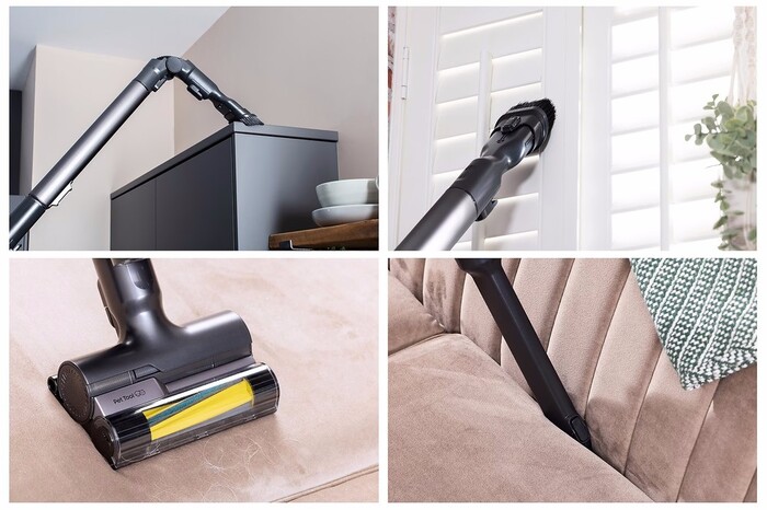 Комплект включает разнообразные насадки мини-турбощетку и электрическую турбощетку для глубокой очистки, телескопическую щелевую и пылевую щетки, угловую насадку, а также микрофибровую салфетку и полотер для влажной уборки. Телескопическая труба и вертикальный тип конструкции обеспечивают удобство манёвра и компактное хранение.