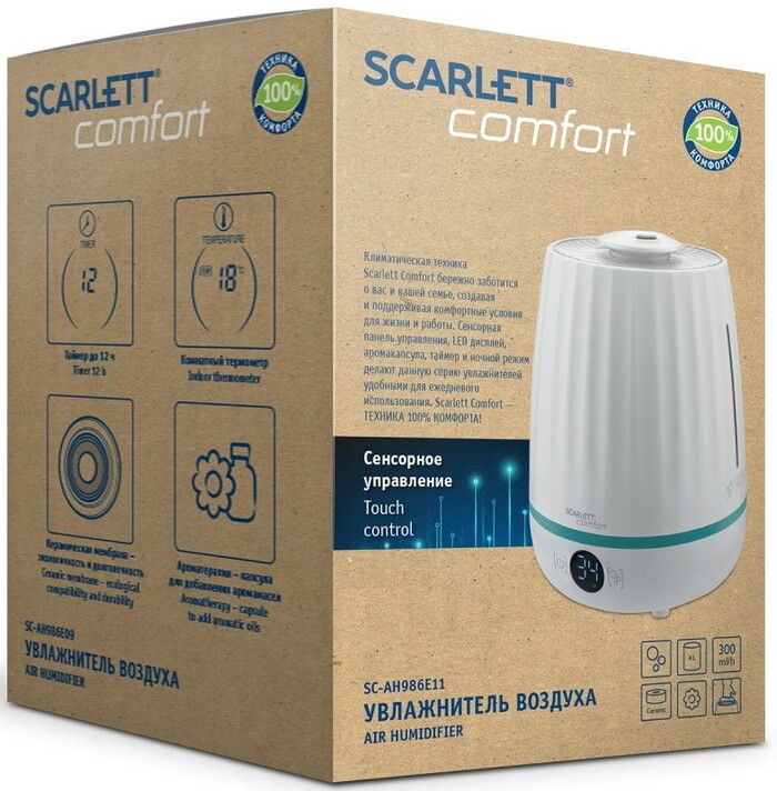 Увлажнитель воздуха Scarlett SC-AH986E11, белого цвета — компактное решение для поддержания комфортного микроклимата в помещениях до рекомендуемой площади 30 м². Устройство использует ультразвуковую технологию распыления, оснащено емкостью для воды 4 л и рассчитано на длительную непрерывную работу при электронном управлении и информативной индикации.