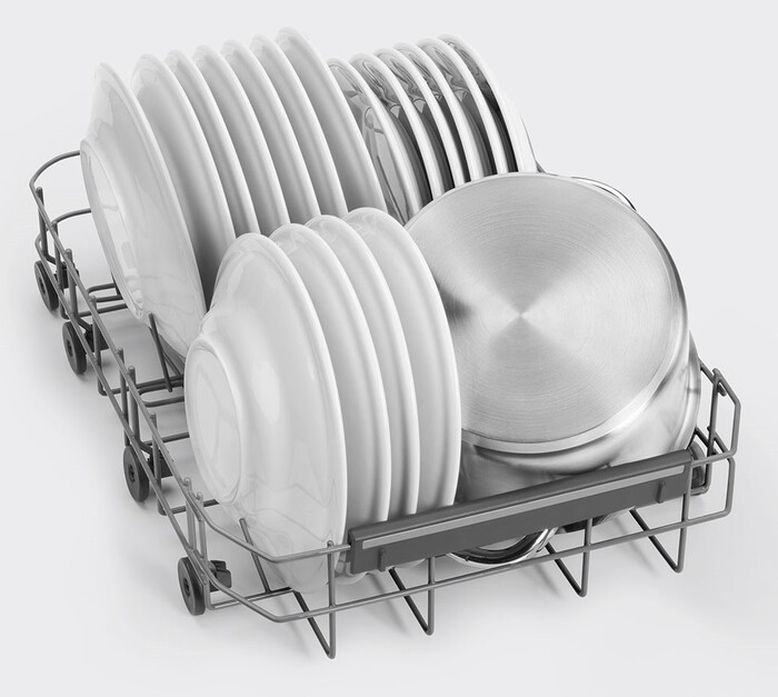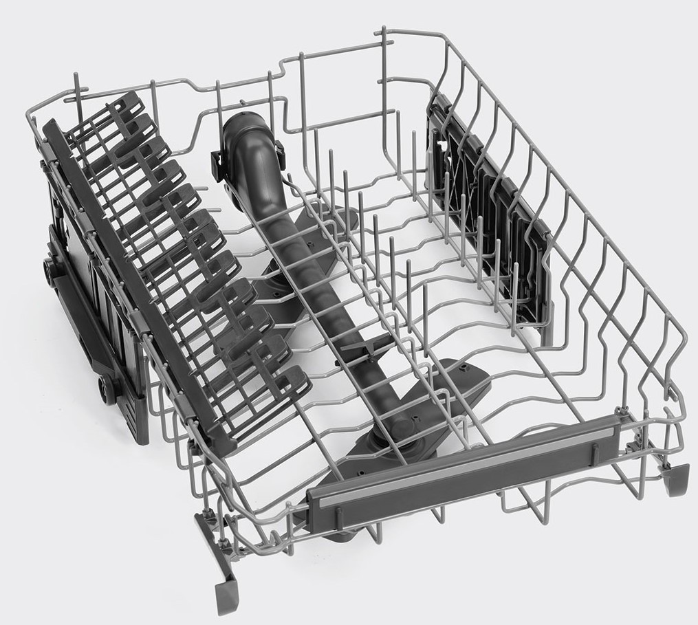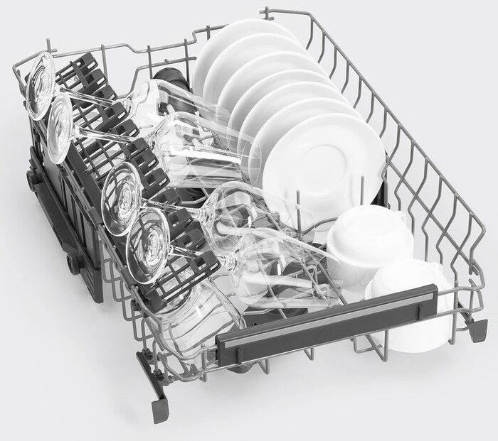 Корзина для столовых приборов имеет регулировку высоты, что адаптирует внутреннее пространство под разные типы посуды. Третий уровень загрузки с дополнительным разбрызгивателем расширяет зону обработки даже самых мелких элементов. Машина поддерживает подачу горячей воды до 60 °С, что ускоряет цикл и улучшает качество мойки. Полная защита от протечек исключает возможность повреждения кухонного пространства, а инверторный двигатель снижает уровень шума до 46 дБ, обеспечивая тихую работу.