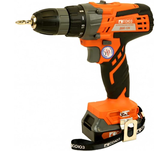 2 аккумулятора - для работы без простоев, Li-lon аккумуляторы: без эффекта памяти, без саморазряда, Быстрая зарядка аккумулятора (всего за 1 час), Металлическая скоба - для подвешивания инструмента на ремень, Подсветка рабочей зоны упрощает ведение работы в условиях недостаточной освещенности, Регулировка частоты вращения для точной настройки под разные материалы, Ремешок для удобства переноски, Удобный кейс решает вопрос хранения и транспортировки СОЮЗ ДШС-12К, Функция реверса упрощает выведение застрявшего в материале сверла