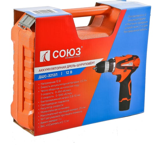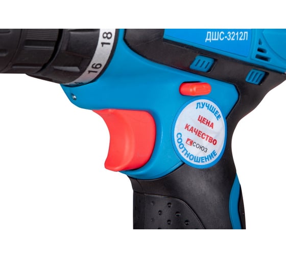 16 ступеней крутящего момента - для работы с разными материалами, Li-lon аккумулятор: без эффекта памяти, без саморазряда, Бытсрозажимной патрон с блокировкой шпинделя - для простой смены оснастки, Встроенная подсветка - для работы при плохом освещении, Наличие реверса, Небольшой вес аккумуляторной дрели-шуруповерт СОЮЗ ДШС-3212Л - для комфортной работы
