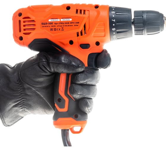 Быстрозажимной патрон для простой смены оснастки, Вентиляционные отверстия для охлаждения двигателя, Малый вес Спец БШЭ-500 СПЕЦ-3428 снижает энергоемкость рабочего процесса, Независимость от заряда батареи и, соответственно, большая производительность без простоев для зарядки, Регулировка частоты вращения для точной настройки под разные материалы, Фиксатор пусковой клавиши для продолжительной работы, Функция реверса упрощает выведение застрявшего в материале сверла