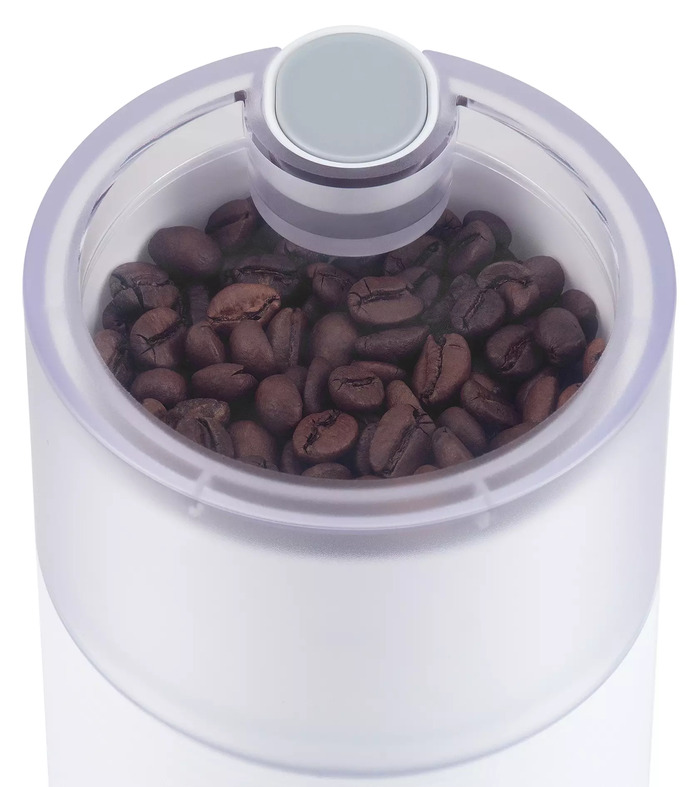 Устройство сочетает минимализм и практичность продуманная компоновка корпуса обеспечивает небольшие габариты при достаточной вместимости. Аппарат работает по привычной схеме с ротационным ножом, что обеспечивает равномерное и быстрое измельчение зерен. Функция импульсного режима дает контроль над временем помола без сложных настроек. Одноступенчатая логика степени помола исключает необходимость дополнительных регулировок, упрощая эксплуатацию. Внешний дизайн выдержан в нейтральной белой гамме, что облегчает интеграцию в любую кухонную среду.