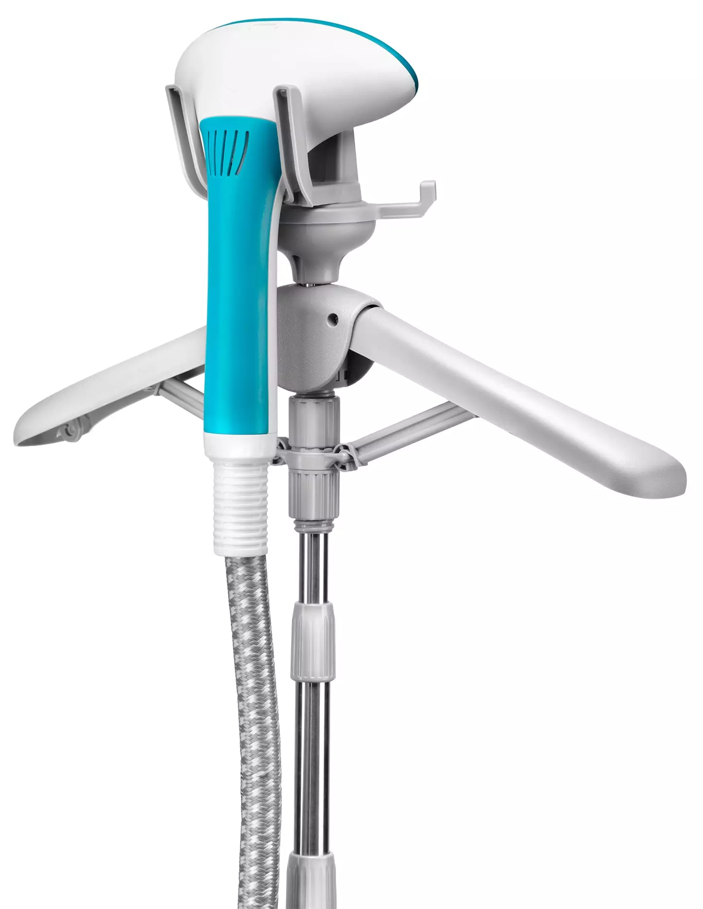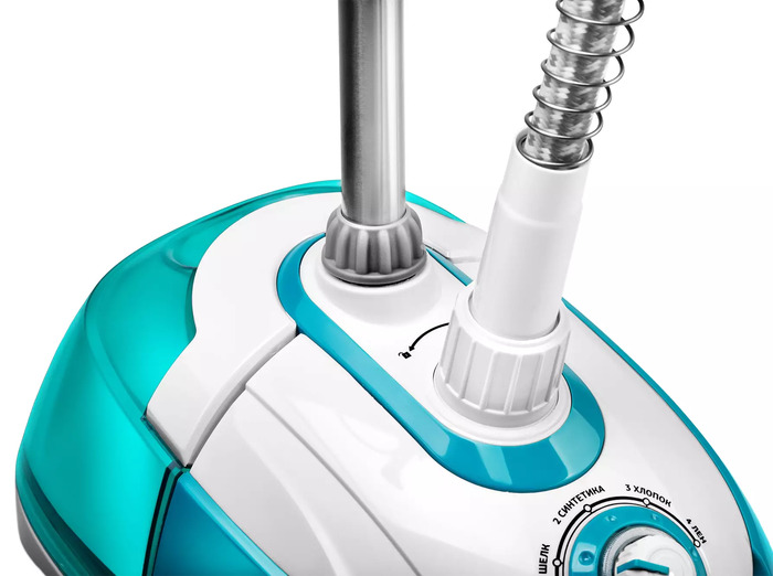 Напольный тип с регулируемой по высоте стойкой и длинным паровым шлангом обеспечивает удобство вертикального отпаривания и возможность горизонтальной обработки при необходимости. Ширина и глубина корпуса вместе с массой делают прибор устойчивым, а длина шнура и длина шланга задают радиус рабочего пространства.