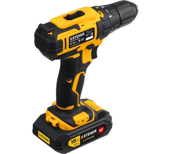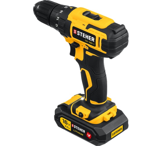 18+1 положений крутящего момента – возможность выбора для разных видов работ и материалов, Блокировка шпинделя – замена инструмента в патроне одной рукой, Быстрозажимной патрон STEHER 16В CD-160-1 – замена оснастки без дополнительного инструмента, Кейс в комплекте – безопасное хранение и транспортировка инструмента, Светодиод подсветки рабочей зоны – комфортная работа в слабоосвещенных местах, Функция реверса – легкое выведение застрявшего в материале сверла