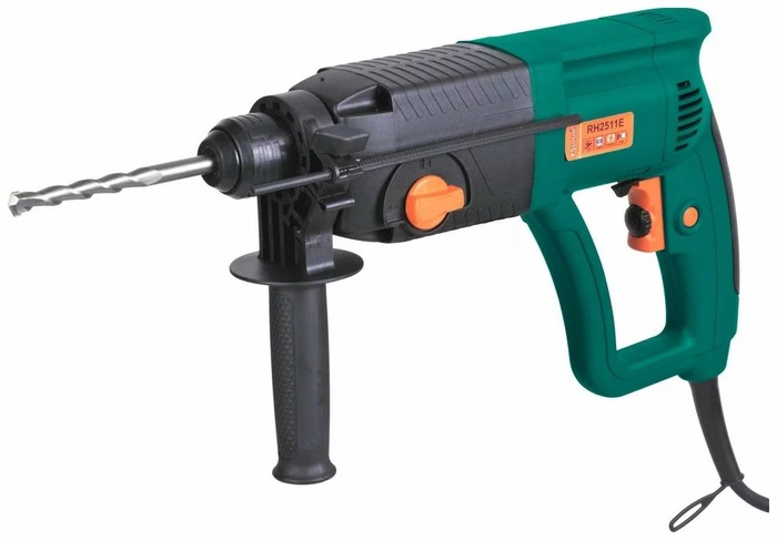 кейс, перфоратор, бур 3 шт, долото, дополнительная рукоятка, запасные щетки, ограничитель глубины, пика, сверлильный патрон 13 мм с адаптером