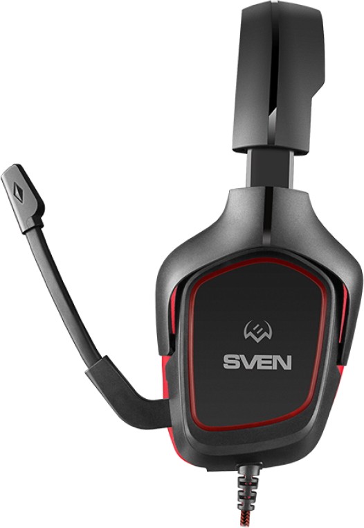 Sven AP-G300MV выполнены в агрессивном игровом стиле с четкими линиями и яркими акцентами. Черно-красная цветовая схема придает гарнитуре дерзкий и современный вид, подчеркивая ее игровую направленность.