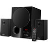 Система построена по схеме 2.1 две фронтальные колонки дополняются сабвуфером, что даёт более полное воспроизведение частотного диапазона. Частотный диапазон от 40 до 20 000 Гц и фазоинвертор направлены на более естественное воспроизведение низких частот, что особенно заметно при фильмах и ритмичной музыке.