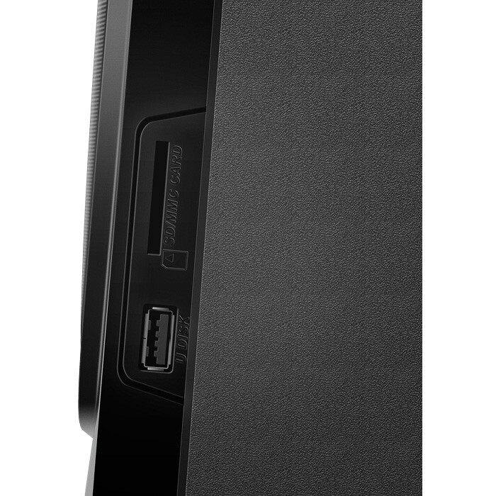 Наличие дисплея и пульта дистанционного управления обеспечивает быстрый доступ к источникам и базовой настройке тембра по ВЧ. Сабвуфер и фронтальные колонки выполнены в корпусах из MDF, что влияет на акустическую жёсткость и внешний вид.