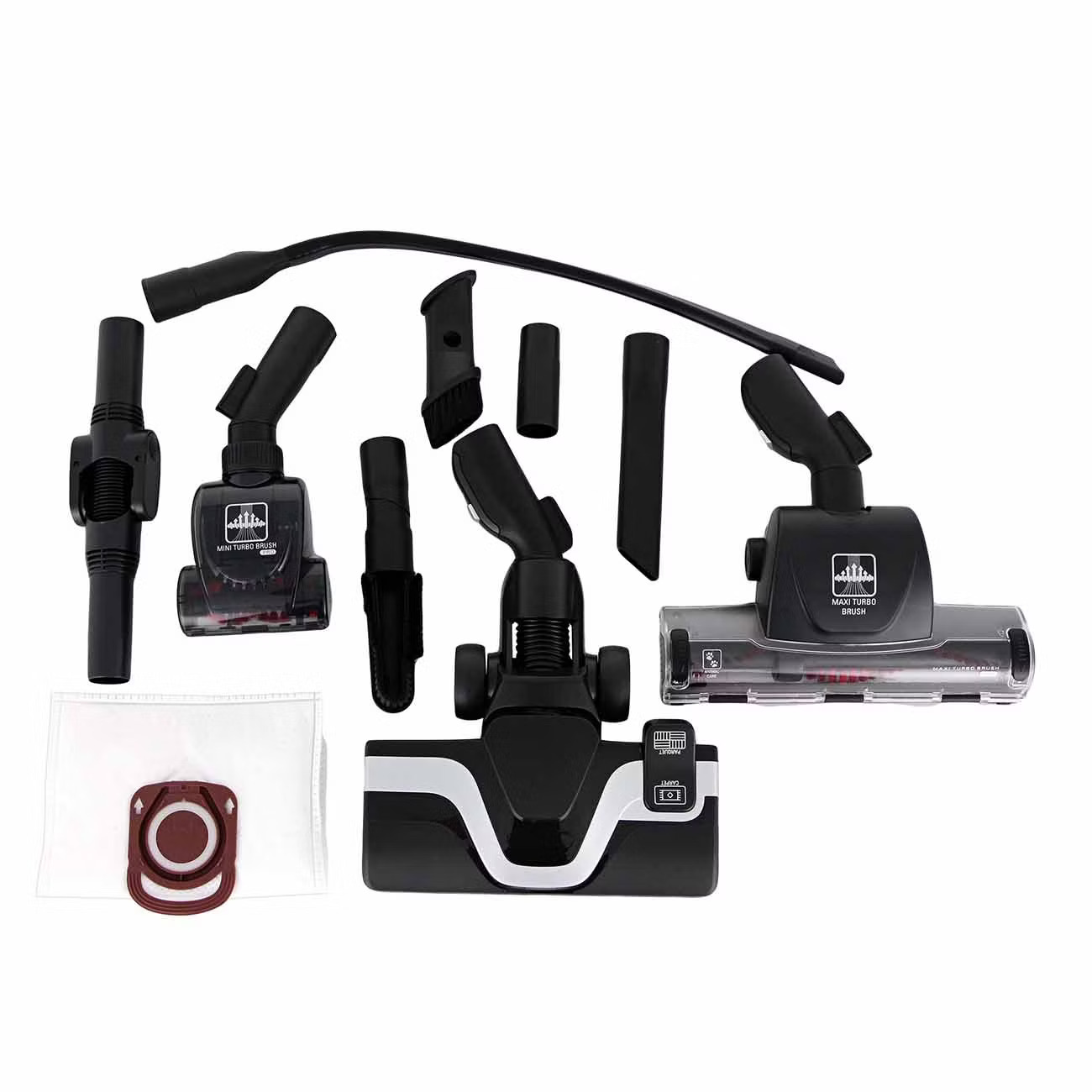 В комплекте поставляются разнообразные насадки для ламината и паркета, мягкой мебели, универсальная для сухой уборки, турбощетка, электрощетка, щелевая и пылевая. Они обеспечивают широкие возможности для очистки различных типов покрытий и труднодоступных мест.