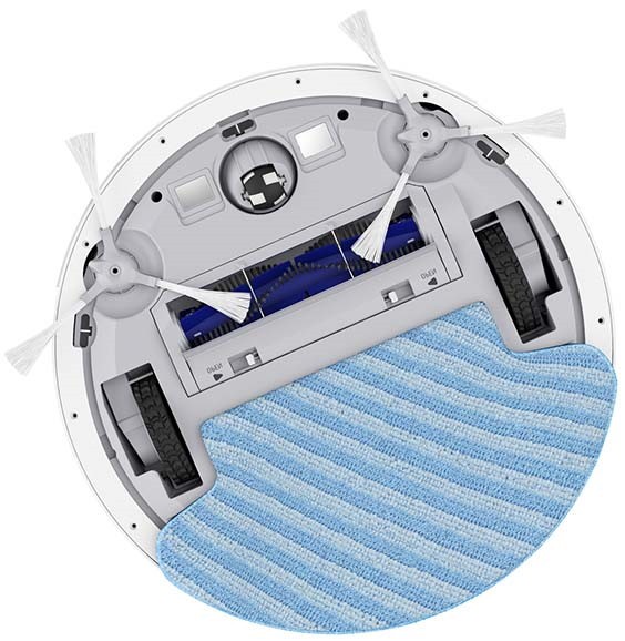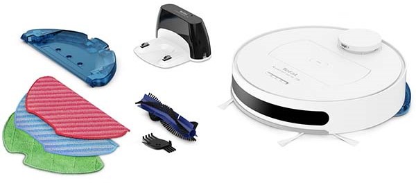В распоряжении робота циклонный фильтр с объемом пылесборника 0,4 литра, что увеличивает время между обслуживанием. Вместе с двумя боковыми щетками и турбощеткой обеспечивается эффективное очищение различных типов покрытий. Для проведения влажной уборки предусмотрена емкость для воды объемом 0,09 литра и комплект из трех влажных салфеток-мини-швабр. Основная щетка и микрофибра способствуют качественной очистке пола от пыли и мелких частиц.