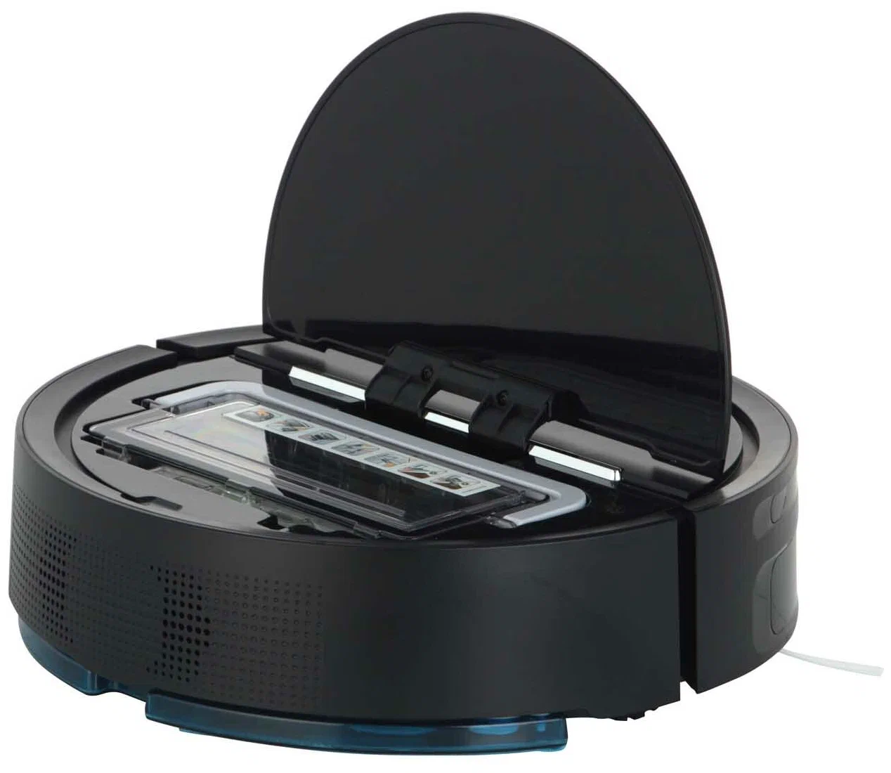 Круглый корпус с габаритами 9,7×34×34 см обеспечивает компактность и маневренность. Робот оснащен двумя боковыми щетками, турбощеткой и насадкой из микрофибры для всесторонней очистки поверхностей. Встроенные часы и автоматическая установка на зарядную станцию поддерживают оптимальный режим работы. Время зарядки аккумулятора составляет 3 часа, а продолжительность работы без подзарядки — до 90 минут. Уровень шума устройства не превышает 72 дБ.
