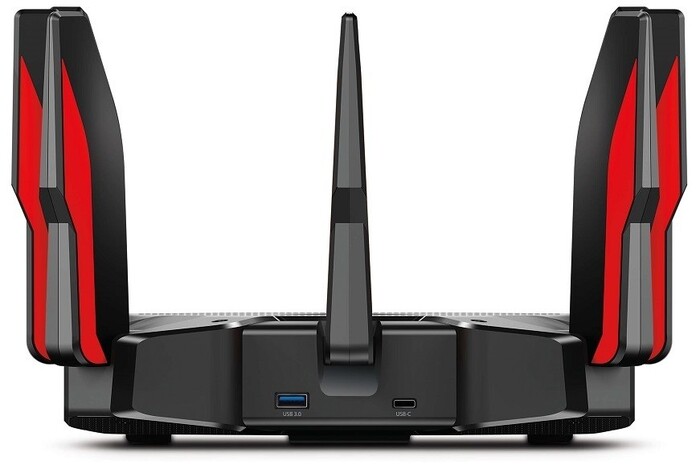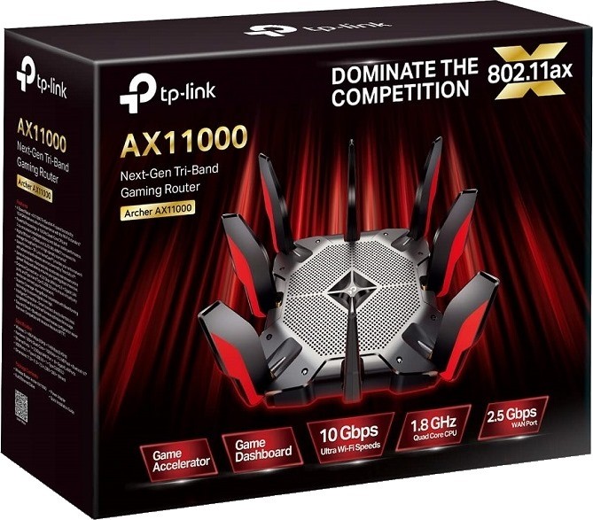 Флагманская модель беспроводного трехдиапазонного геймерского маршрутизатора (роутера) TP-Link образца 2020 года. Относится к ультраскоростным устройствам класса AX11000, которые полностью поддерживают Wi-Fi 6 и технологию многоканальной передачи данных MU-MIMO. Как и другие топовые модели TP-Link, AX11000 имеет три рабочих диапазона Wi-Fi. Один приемопередатчик работает на частоте 2,4 ГГц и способен пропускать через себя до 1148 Мбит/с, два других работают в диапазоне 5 ГГц и могут обрабатывать до 4804 Мбит/с каждый.