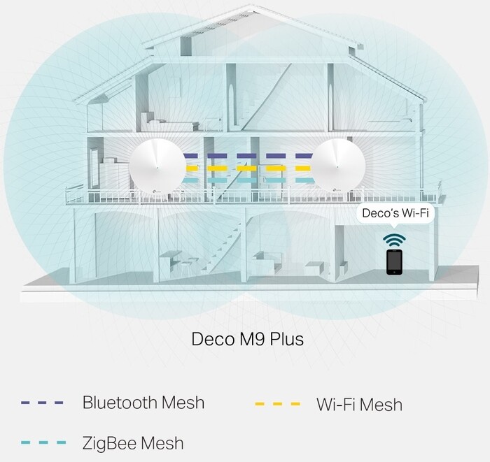 Mesh-система TP-LINK Deco M9 Plus (2-pack) позиционируется как продукт средней ценовой категории образца 2019 года. Предназначена для оборудования трех/четырехкомнатных квартир, небольших двухэтажных домов и других жилых зон, насыщенных беспроводными устройствами. Практичный светодиодный индикатор позволит быстро оценить качество приема и легко найти наилучшее место для размещения блоков системы.