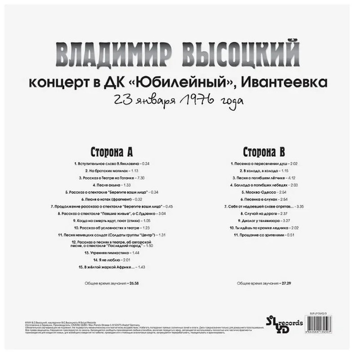 Виниловая пластинка Владимир Высоцкий – Концерт в ДК "Юбилейный" Ивантеевка LP