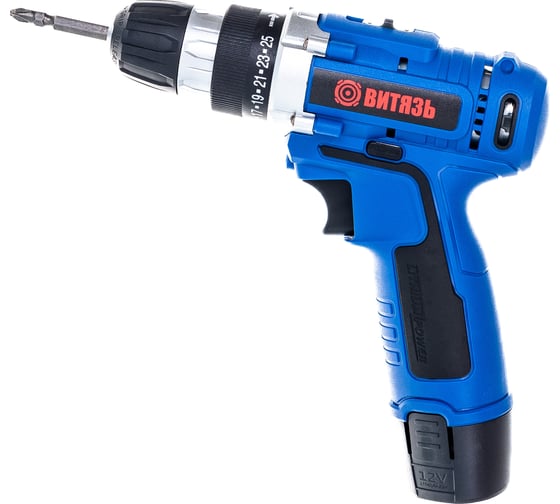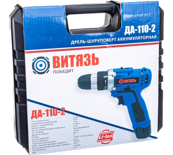 2 аккумулятора - для работы без простоев, Li-lon аккумуляторы: без эффекта памяти, без саморазряда, Аккумуляторная технология избавляет оператора от необходимости следить за шнуром питания, Быстрозажимной патрон для простой смены оснастки, Кейс для удобства хранения и транспортировки Витязь ДА-110-2 18012010, Регулировка частоты вращения для точной настройки под разные материалы, Функция реверса упрощает выведение застрявшего в материале сверла