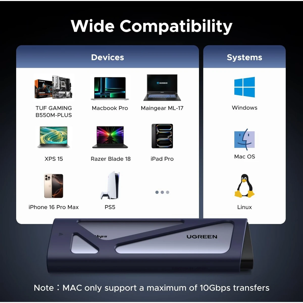 Корпус автоматически определяет тип установленного накопителя и обеспечивает совместимость без необходимости переключения вручную