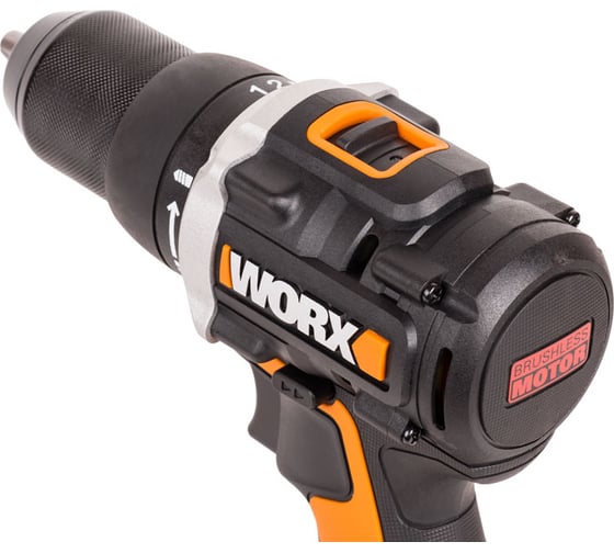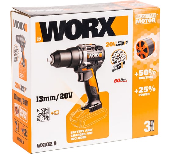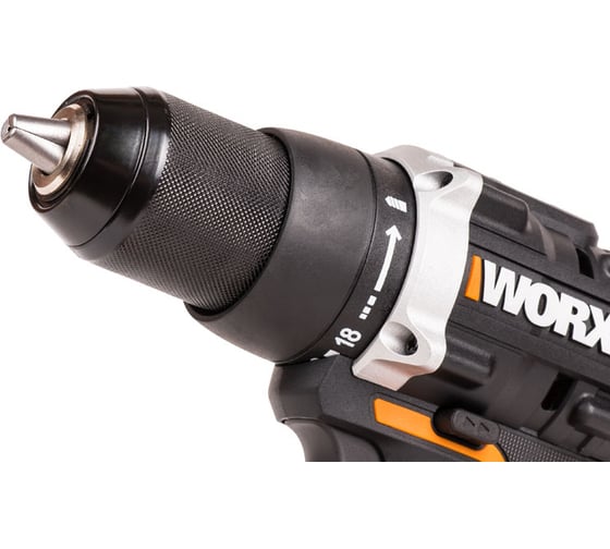 WORX PowerShare, А наличие индикатора заряда батареи прямо на корпусе инструмента, позволит всегда контролировать время оставшейся работы, Быстрозажимной 13-ти миллиметровый патрон имеет блокировку шпинделя и позволяет менять оснастку одной рукой. Для подготовки WORX WX102.9 к работе потребуется минимум времени и усилий, Быстрозажимной патрон, Гибкая настройка, Конструкция WORX WX102.9 предусматривает все для комфортной эксплуатации. Эргономичная рукоятка с резиновым покрытием и вес чуть более 1кг способствуют уверенному хвату и полному контролю за инструментом. Ударная дрель оснащена LED подсветкой, обеспечивающей комфортную и безопасную эксплуатацию даже в условиях ограниченной видимости. Для удобства переноски, корпус устройства дополнен поясным крепежом, Современные бесщеточные двигатели Brushless Motor TM получили на 25% больше мощности и увеличенный в 10 раз срок службы, в сравнении с щеточными аналогами. Имея максимальный крутящий момент 60Нм, двигатель обеспечивает скорость вращения шпинделя от 600 до 2000 оборотов в минуту, Удобство использования, Универсальная дрель-шуруповерт легко адаптируется под любые задачи. Дрель предусматривает 2 скорости – для сверления и работы с крепежом, 18 ступеней регулировки крутящего момента и настройку стороны вращения. Гибкая настройка инструмента позволяет аккуратно сверлить материалы разной плотности, Универсальные компактные аккумуляторы серии Powershare – это емкие и долговечные источники питания с электронной платой защиты от глубокого разряда и перегрева. Литий-ионные батареи гарантируют быстрое начало работы и могут использоваться с другими инструментами WORX., Электродвигатель нового поколения