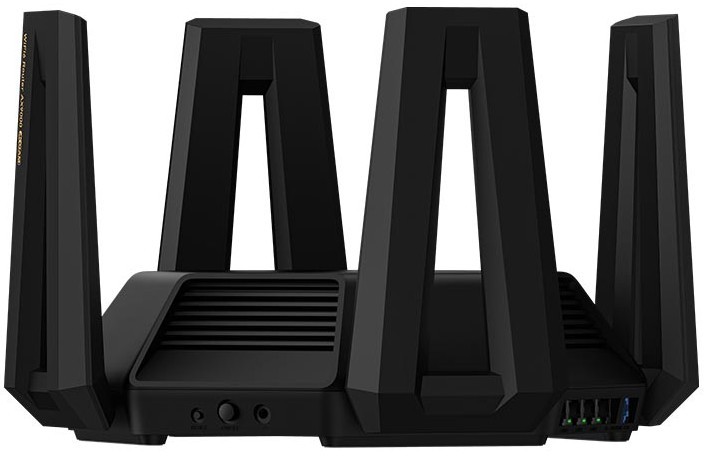 Топовый высокопроизводительный игровой беспроводный трехдиапазонный маршрутизатор (роутер) 2021 года с поддержкой стандарта Wi-Fi 6 (802.11n/ac/ax), скоростным портом USB 3.2 Gen1 и полосой пропускания 160 МГц. В дополнение к обычной сети (2,4 ГГц), создает две сети 5,2/5,8 ГГц, причем вторая специально предназначена для игрового трафика. Способен обеспечить сверхбыструю передачу данных (класс AX9000) и сверхмалые задержки для комфортного гейминга в любых современных игровых проектах и киберспортивных дисциплинах.