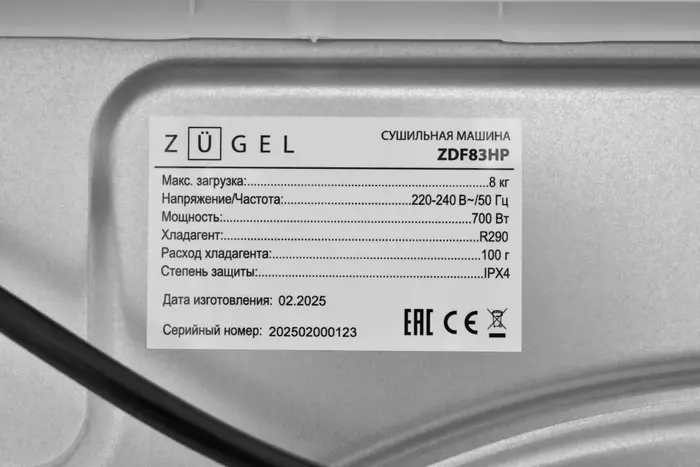 Сушильная машина с тепловым насосом Zugel ZDF83HP, Белый